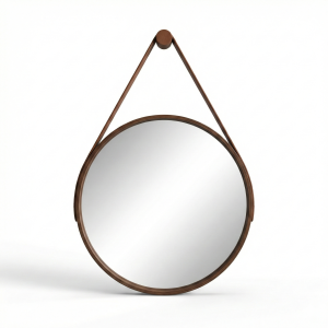 Round Hanging Wall Mirror with Wooden Frame & Leather Strap – Designer Mirror