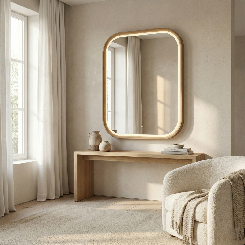 Rounded Rectangle LED Wall Mirror – Wooden Frame Designer Mirror